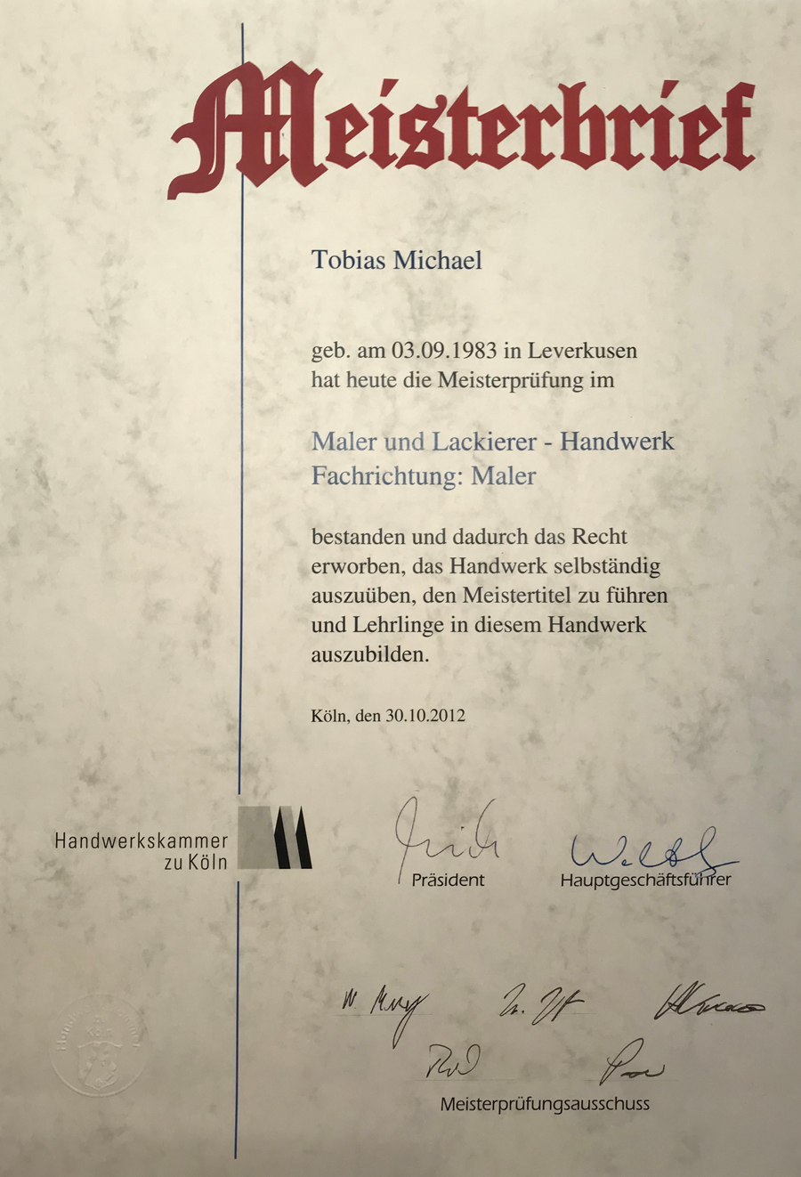 Geschäftsführer Tobias Michael: Geboren und aufgewachsen bin ich in Leverkusen. Seit über 10 Jahren wohne ich nun schon in Kerpen Horrem, wie im Karneval. Nach der Ausbildung zum Modellbauer habe ich ins Malerhandwerk gewechselt und die Meisterprüfung abgelegt. Dieses Handwerk fand ich vielseitiger und näher an meiner kreativen Ader.